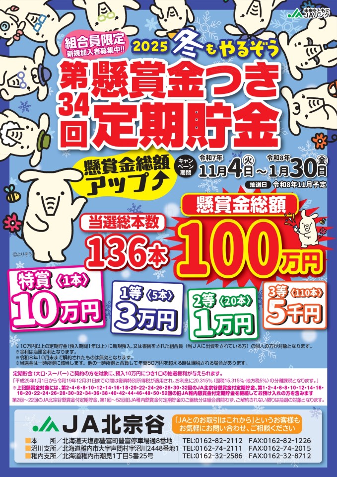 2025冬の懸賞金付き定期貯金キャンペーンのご案内!! 2025年11月01日 管理者 JAバンク JA北宗谷 くらし 令和7年11月4日(火)より『第34回 冬の懸賞金付き定期貯金』の取扱いを開始致します。定期貯金10万円で1口の抽選対象になり、今回は懸賞金総額100万円(当選総本数136本)にアップして更に当選チャンス!! この冬の貯金はぜひJA北宗谷の懸賞金付き定期貯金へ!!